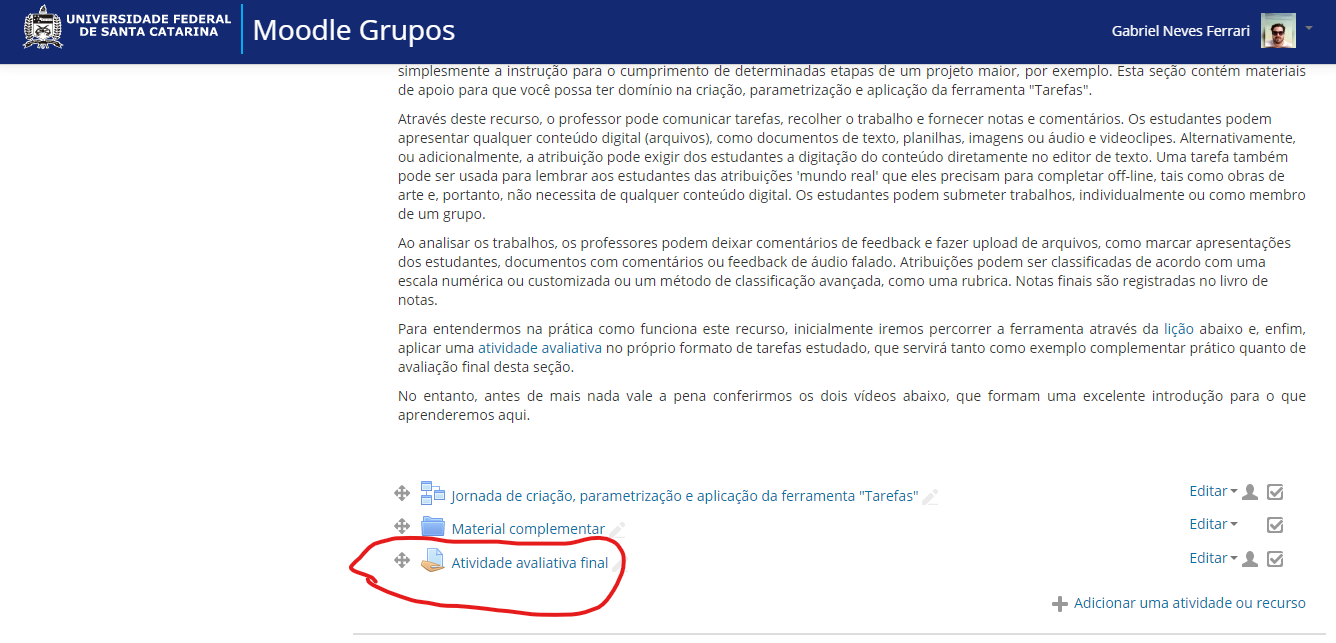 O primeiro passo é clicar em "Adicionar uma atividade ou recurso":